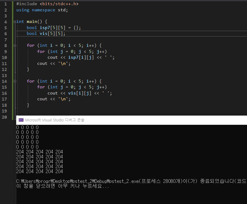 그동안은 거의 매번 전역변수로 선언을 하면서 알아서 초기화가 되기때문에 신경을 많이 안썼는데, 이번에 접하게 된 문제에서 (1941) 지속적으로 새롭게 bool 2차원 배열을 선언해서 초기화를 시키고, 그 값에 새롭게 쓰는 과정을 반복하는데 그 과정에서 만약 초기화를 안한다면 (={};) vis[i][j]를 출렸했을때의 결과처럼 의도치않은 결과물이 출력될 수 있다. 쓰레기값이 있을테니까 항상 전역변수로 하던 습관때문에 지역변수로 선언했을때 조심하도록 하자.