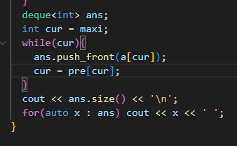 deque를 활용하여서 push_front(a[cur]);을 시행하는데,