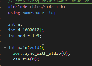 참고 코드의 경우 int mod=1e9; 로 표현하였다.