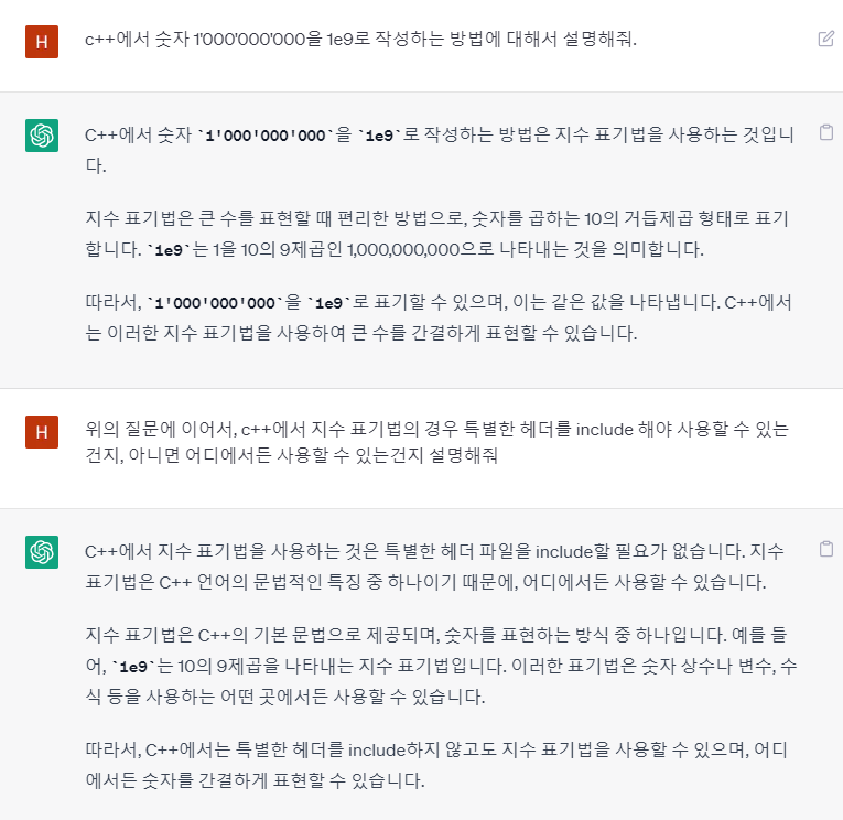 여기서 10억에 해당하는 1'000'000'000을 c++에서 간단하게 1e9로 표현할 수 있다는걸, 과거부터 관련된 표현들을 사용하면서 몇번은 접해보았으나 이렇게 쉽게 1e9로 작성해버리니까 이 표현법에 익숙해지고 나도 좀 사용해야 겠다는 생각이 들었다.