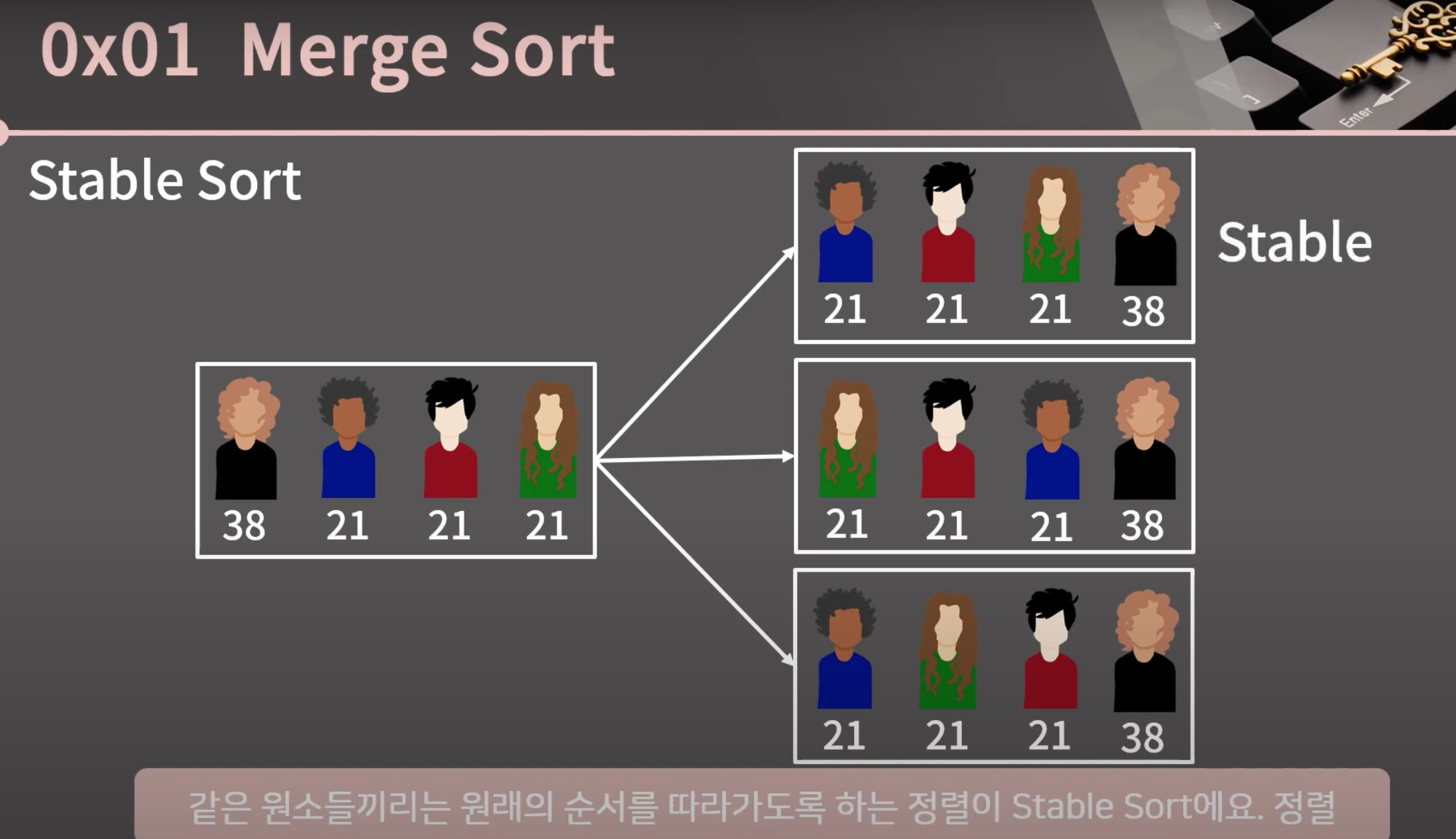 이처럼 기존의 동일 원소의 순서를 변경하지 않는것이 stable sort이다.