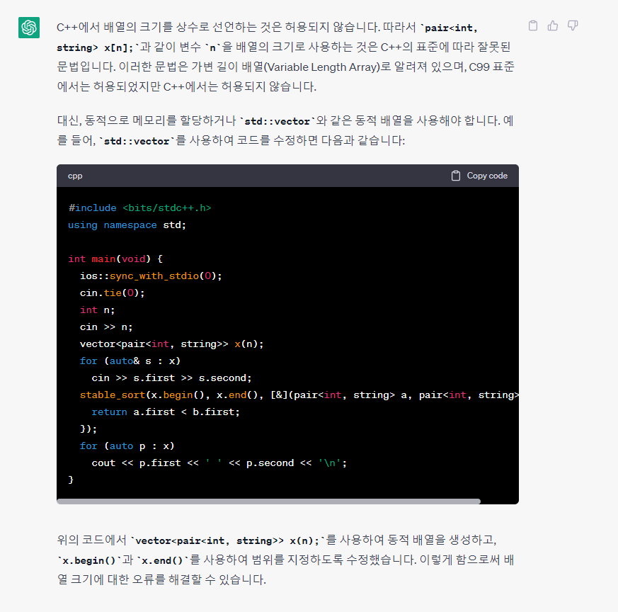 이 코드를 접하게 되었고, 이때 지속적으로 pair<int,string> x[n]; 에서, x[n]에서 '식에 상수 값이 있어야 합니다' 오류를 발생하고 그리고 애초부터 그동안 pair<int,string> x[n]; 형태로 pair<int,string> 타입의 배열 x를 런타임중에 받은 n이라는 변수로 배열사이즈를 정해서 사용하는 문법을 처음 보았기 때문에 이에 대해서 검색해보았다.