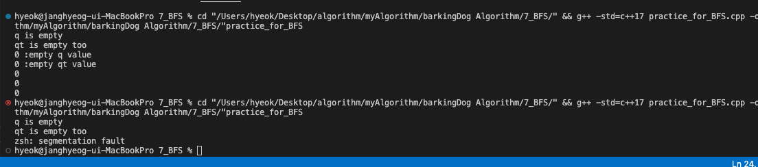 두번째. 블락1을 주석처리 하고 queue인 q와 qt에 원소를 넣었다가 빼내지 않은 경우, 분명 empty()이고, q.front(), qt.front()를 출력해보면 세그멘테이션 폴트가 발생한다.