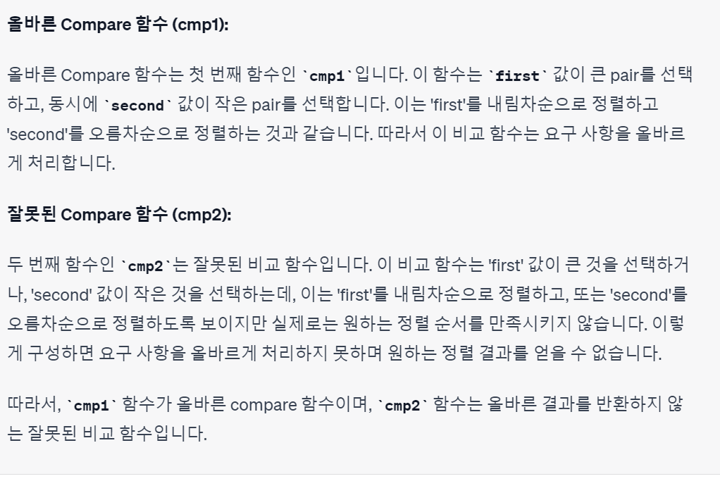 재미있는 점은, 내가 작성한 compare 함수에 대한 분석과 올바른 compare 함수를 찾아달라고 하니까,