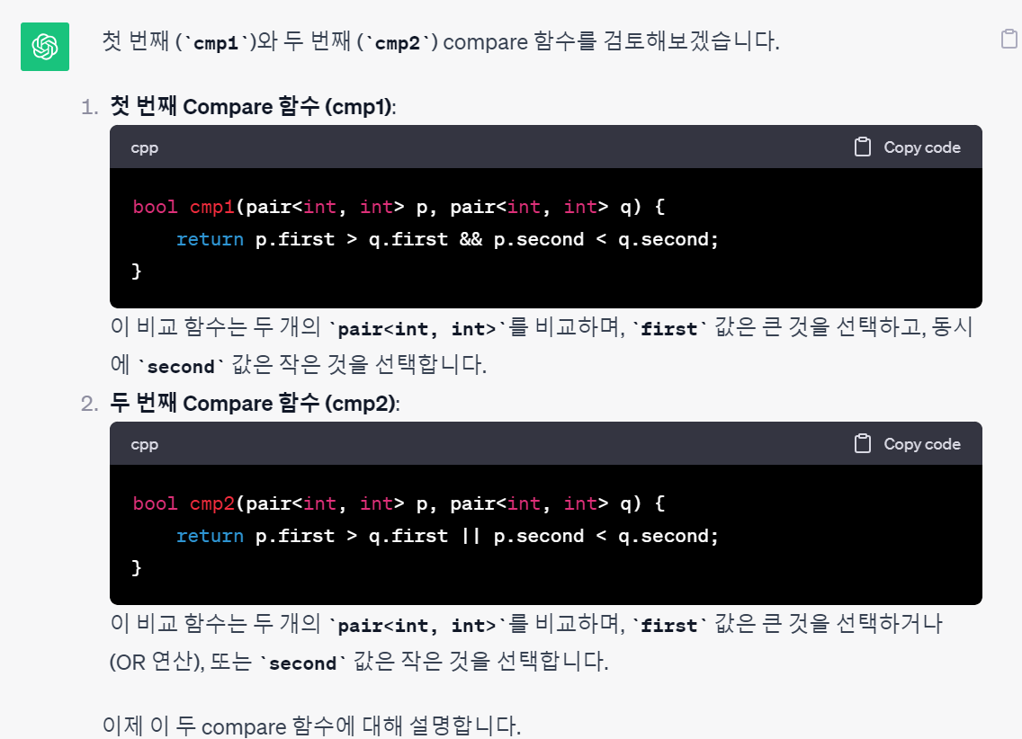 처음에, pair 끼리의 비교에서 first는 내림차순으로, second드는 오름차순으로 비교하는 함수를 cmp 함수로 만들어서 제공할때,