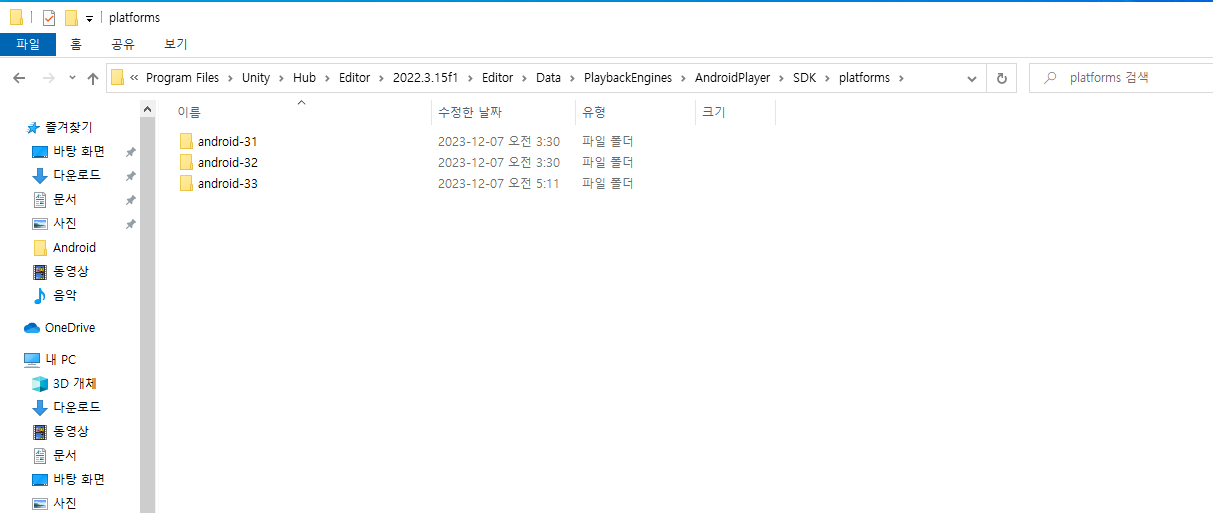 (확인할 위치 C:\Program Files\Unity\Hub\Editor\2022.3.15f1\Editor\Data\PlaybackEngines\AndroidPlayer\SDK\platforms)