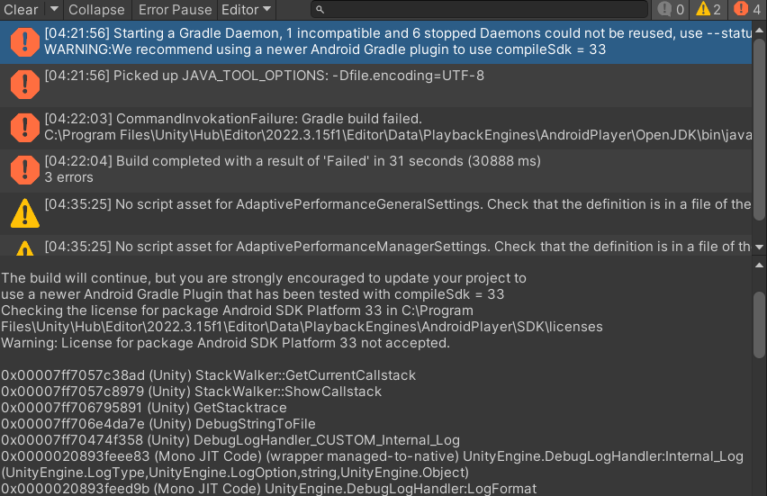 Checking the license for package Android SDK Platform 33 in C:\Program Files\Unity\Hub\Editor\2022.3.15f1\Editor\Data\PlaybackEngines\AndroidPlayer\SDK\licenses