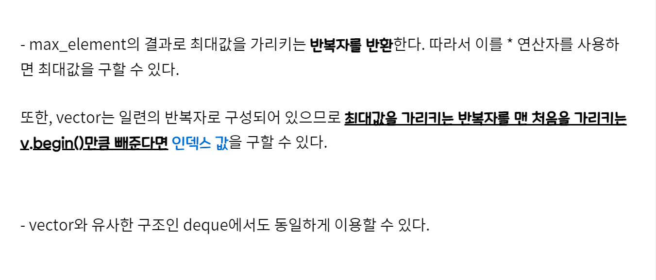 1. 최대값, 최소값 vector 컨테이너에서 최대값, 최소값을 구할 경우 for문을 작성할 수도 있지만 이는 복잡하다. 그래서 algorithm 라이브러리의 있는 max_element를 사용한다면 한줄로도 간단하게 최대