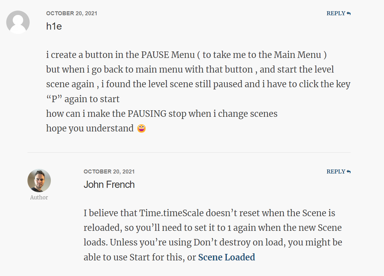 이와 연관 있을만한 첫번째 아티클에서의 댓글과 해당 아티클 작성자의 정보전달 부분이 있어서 덧붙인다. 씬을 리로드 할때 Time.timeScale을 다시 조정해주어야 하는 것으로 보인다.