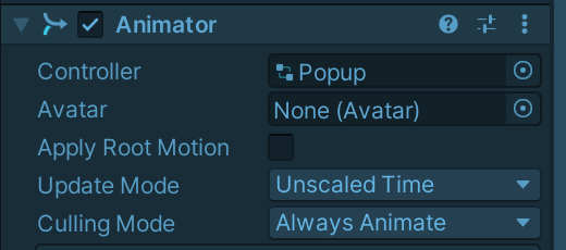 이때에 Animator 컴포넌트의 Update Mode 에서 Unscaled Time 을 선택하면 해당 문제를 해결 할 수 있다는것을 알게되었다.
