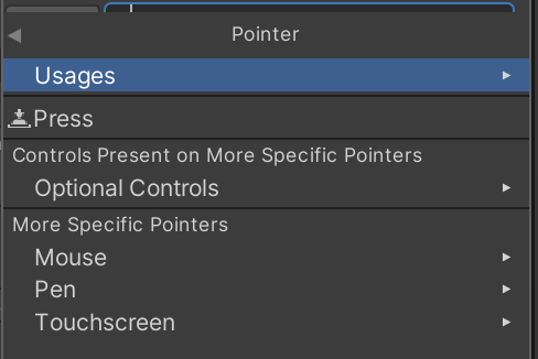 여러가지 시도를 해보던중에, press[Mouse] 가 아닌, press[Pointer] 를 사용하게 되었는데 정상 작동 하는 것을 확인할 수 있었다. 이때에 [Pointer] 의 경우는 아래의 이미지를 통해 알 수 있듯이, 마우스, 터치패드, 펜 등을 모두 아우르는 개념이라는 것을 알 수 있었다.