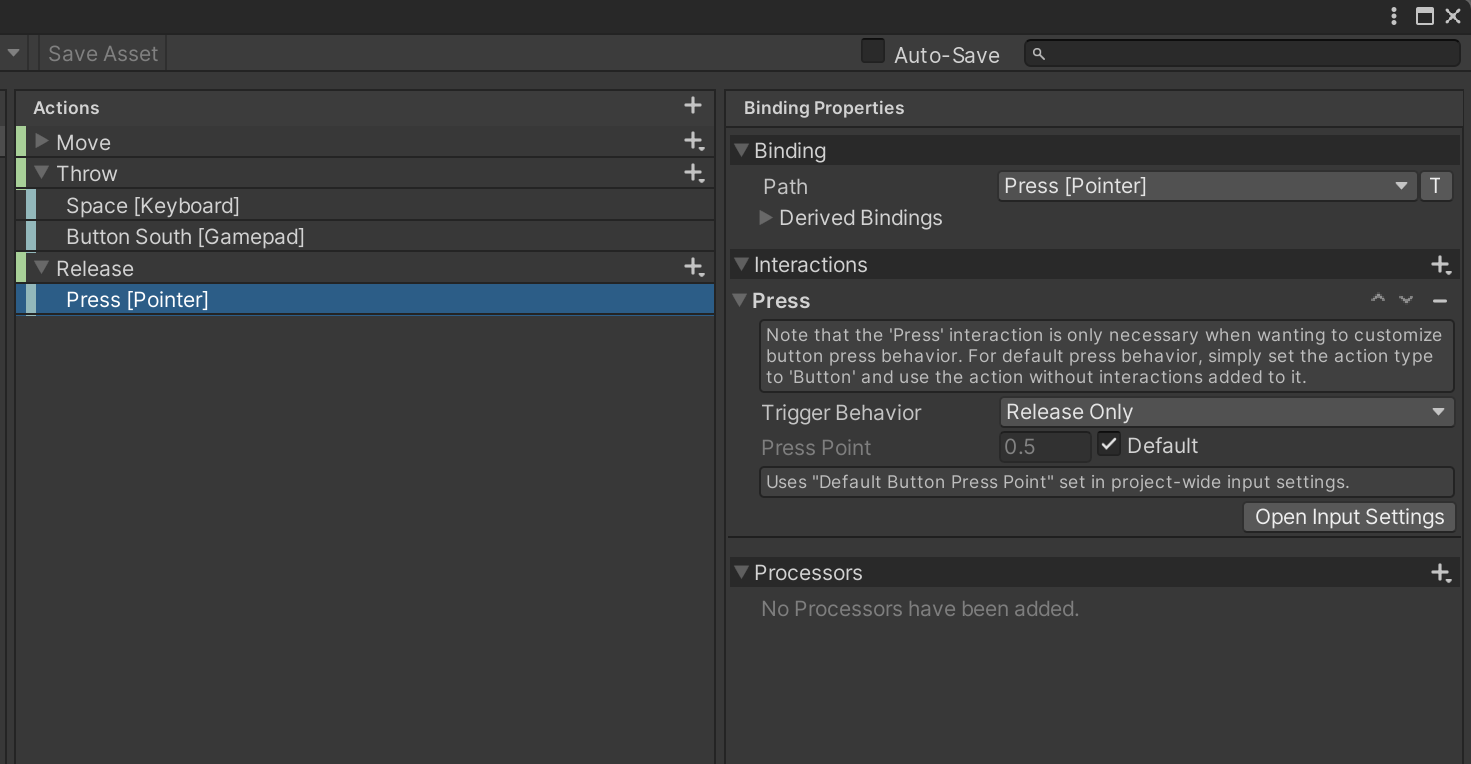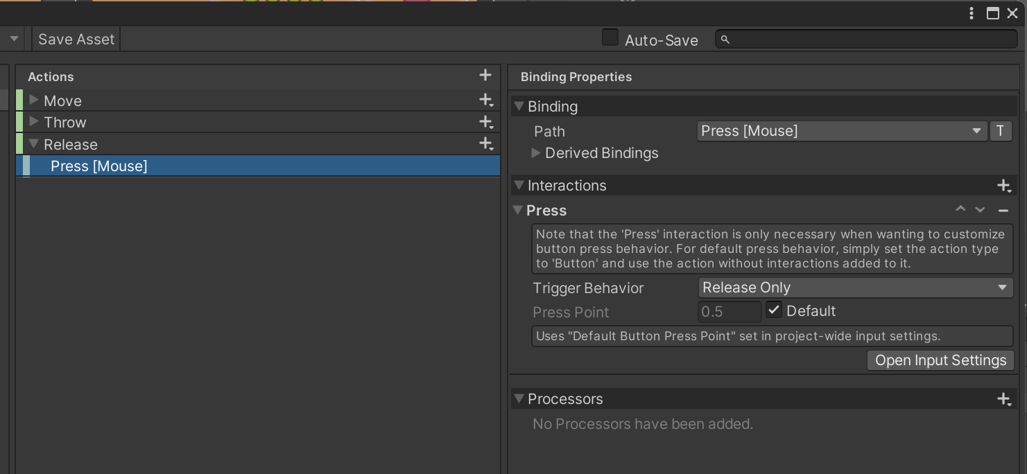 이때 위에서 유니티의 New Input System 을 이용하는 상황에서, Release 라는 이름의 Action 에서 보여주듯이, 처음에는 Press [Mouse] 형태로 작성해서 Release Only 로 실행했는데, 이렇게 했을시에 지속적으로 마우스 입력을 받아들이지 못하고 아무런 처리가 발생하지 않는 문제가 발생하였다.