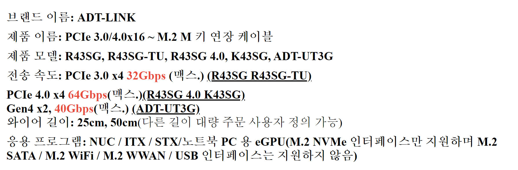 73171.0₩ |ADT R43SG 4.0 M.2 NVMe to PCIe 3.0 / 4.0 X16 GPU PCI E 16x to M.2 M 키 연장 케이블 어댑터, eGPU NUC ITX STX