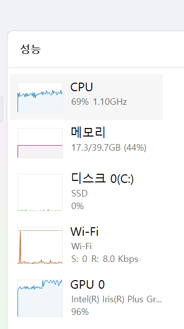 위와 같은 상황을 통해 유니티에서 플레이 모드에 진입했을시에 내장 그래픽의 이용률이 증가하면서 cpu의 클럭스피가 줄어드는것이고, 이때 두개까지 플레이 하면 GPU 이용률이 더욱 증가하면서 CPU 클럭이 0.9GHz 까지 하락하는 상황이라고 진단 내릴 수 있을것 같다.
