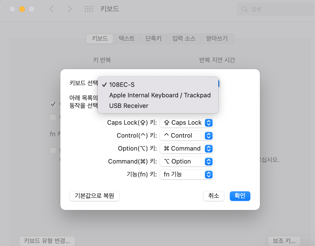 현재 내가 설정한 모습. 키보드 선택할때 108EC-S 가 선택되어 있는 상황에서 아래와 같은 설정을 하고나니, 맥북의 기본 키보드는 입력의 위치가 변경되지 않으면서 현재 사용중인 연결시킨 키보드만 아래와 같이 키 위치가 바뀐 것으로 입력되어서 동작한다.