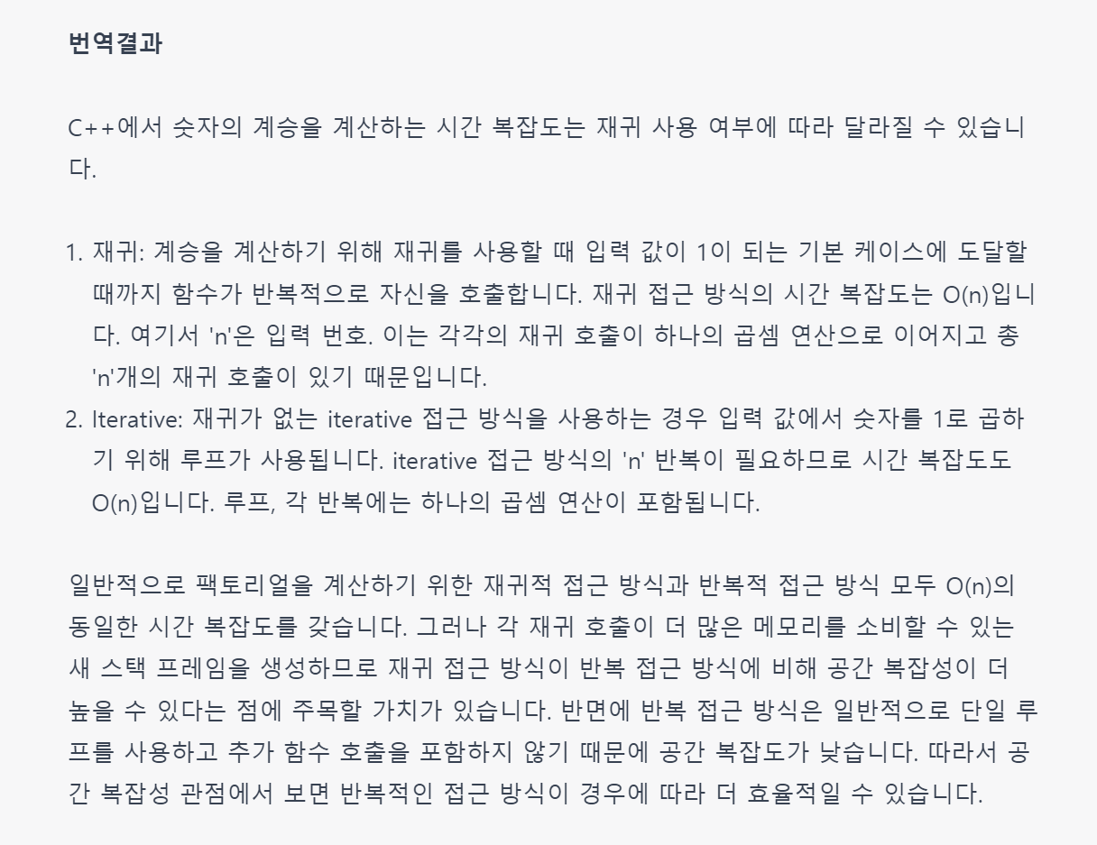 재귀를 사용하여서 팩토리알을 구현하는 방법과, 반복법을 사용하여서 팩토리알을 구현하는 방법에서의 시간복잡도 차이가 궁금하여서 실질적으로 코드를 제출해보고, 그리고 또 gpt에 질문도 해보았는데,