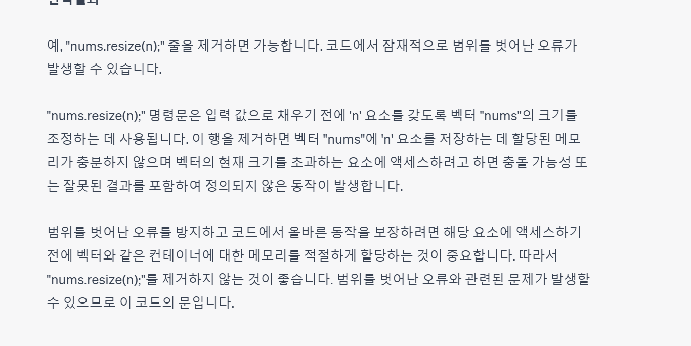 처음에 이런식의 문제 풀이 부분을 접했을때, 그동안은 resize() 함수를 사용하는 경우가 없어서 왜 이걸 사용해주어야 하는지 궁금했고, 이 부분을 제거했을때 어떤식으로 반응하는지 궁금했는데, 일단 runtime error가 발생하고, 이걸 그대로 제출하면 out of bound가 뜬다.