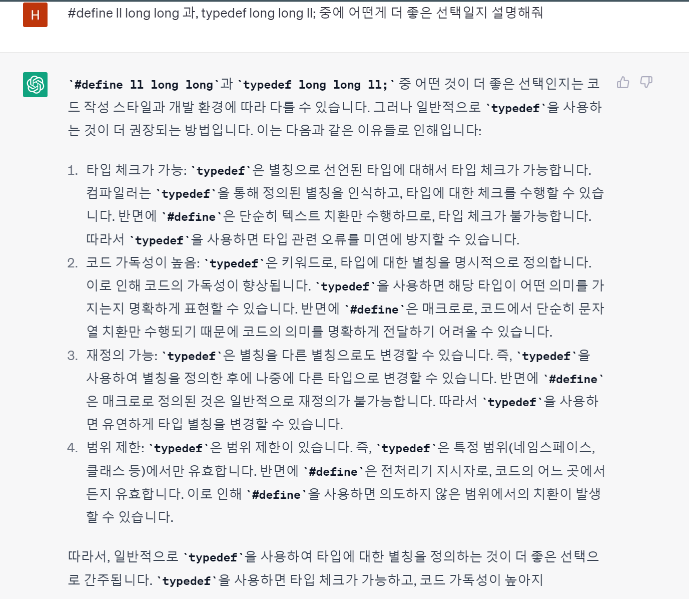 -두번째로 typedef long long ll; 이렇게 작성하는 방법이 있는데, 지금까지는 #define 형태의 전처리지시문이 익숙해서 typedef에 대해서 많이 접해보지 못해서 내가 사용하여야 할때는 사용하지 못했지만, 이번에 접한 코드에서 이러한 형태로 제시를 해주어서 차이점에 대해서 검색해보았다.