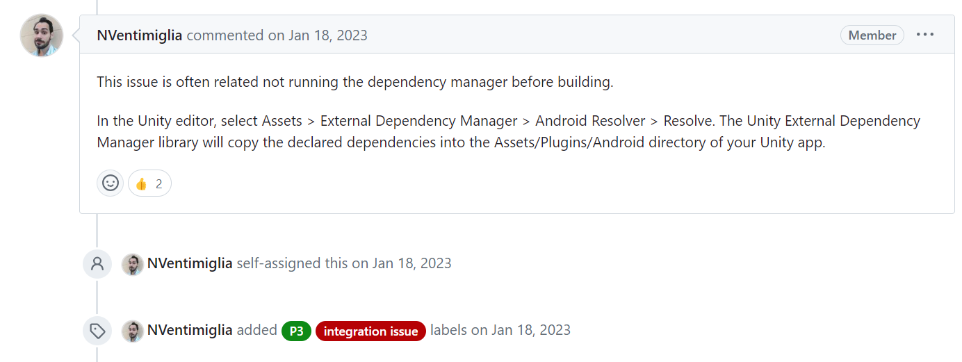 External Dependency Manager -> Anroid Resolver -> Resolve 를 하라는게 가장 기본이 되는 접근인것 같다
