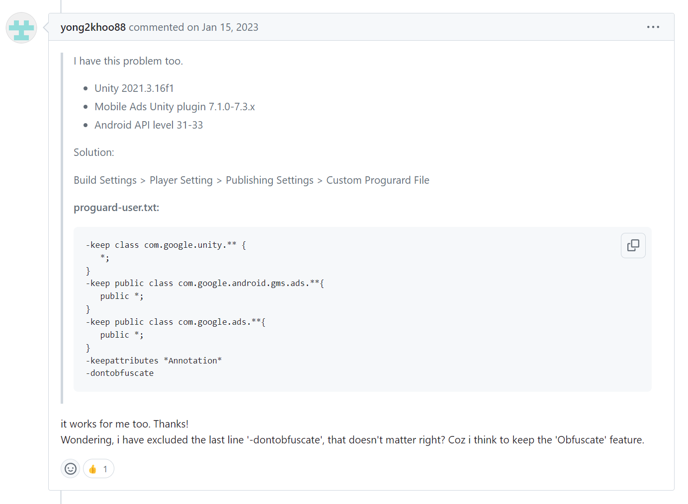 이렇게 -dontobfuscate 를 제외해도 문제없다는 사람이 추가적으로 있다.