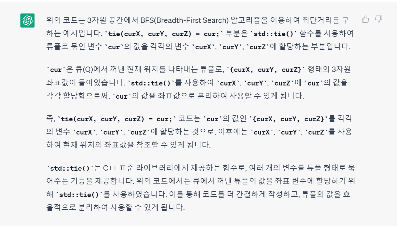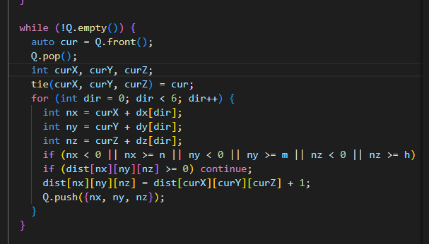 그리고 tie(curX,curY,curz)=cur; 형태가 어떤 연산을 하는것인지 몰라서 검색도 해보고 고민도 해보았다.