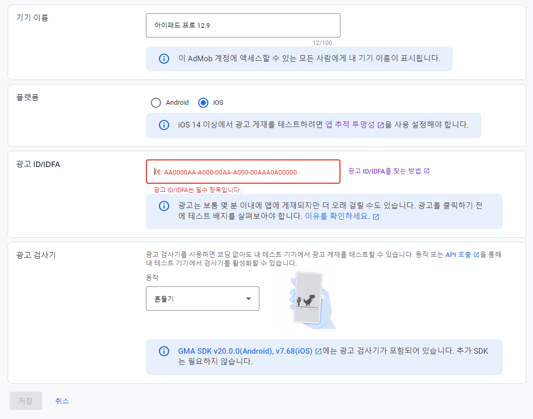 아이패드로 테스트 기기를 등록하고 테스트를 진행하려는데 IDFA 를 파악한뒤에 해당 내용으로 등록하려고 하니까 플랫폼 선택시에 iOS 를 선택하니 이와 같은 메세지를 확인할 수 있었다.
