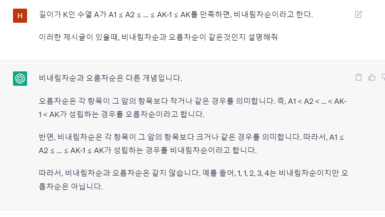 비내림차순은 오름차순이 아니고, 오름차순은 확실히 다음항이 더 커야 한다.